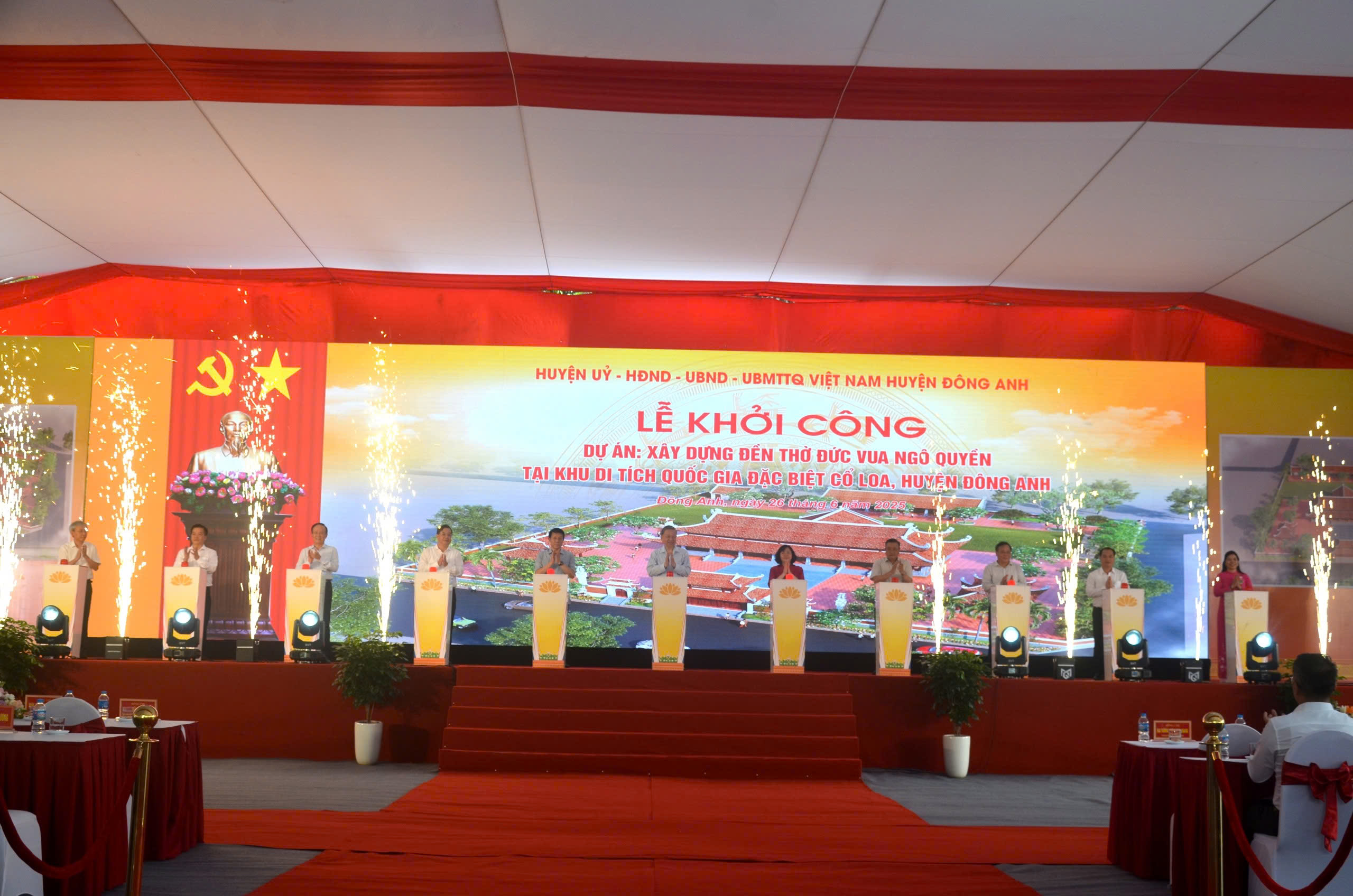 + Today: The installation ceremony is called the Reception and Handover Ceremony, chaired by the Party Committee, People's Committee, and Fatherland Front Committee of Co Loa commune, and handed over to the managing unit, the Management Department of Cổ Loa vestige site, belongs to the Thăng Long - Hanoi Heritage Conservation Center.