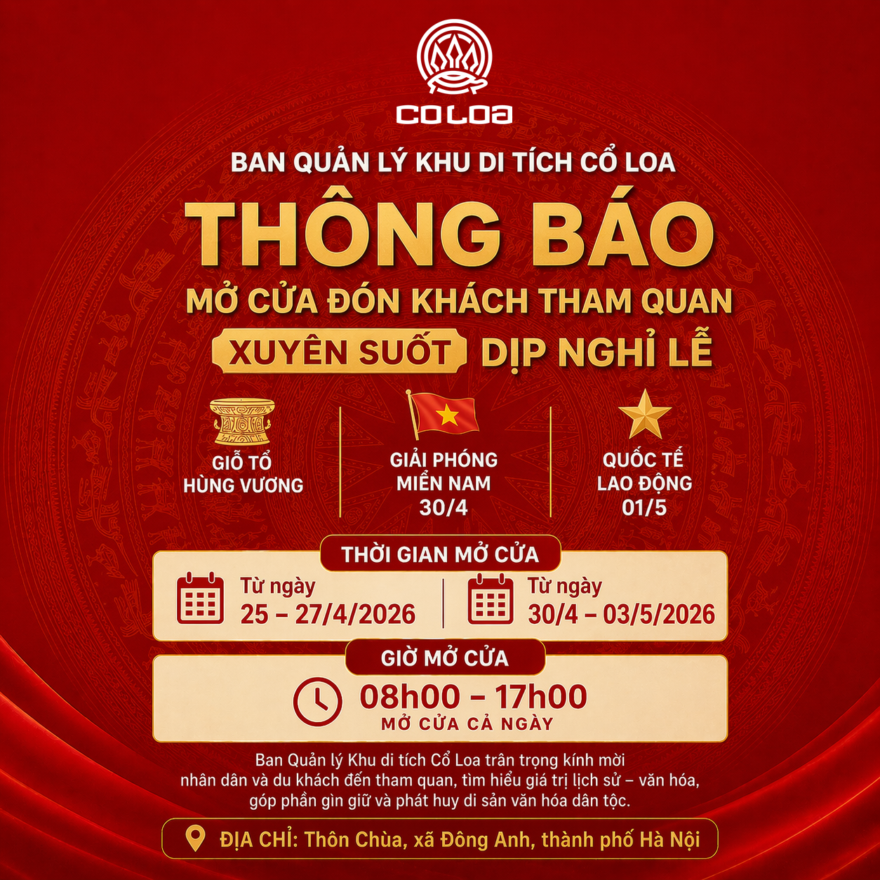 Sáng ngày 23/4/2026 (tức ngày mồng 7 tháng 3 năm Bính Ngọ) – nhân ngày húy kỵ Đức vua An Dương Vương, tại Khu di tích Cổ Loa, Trung tâm Bảo tồn Di sản Thăng Long – Hà Nội, Ban Quản lý Khu di tích Cổ Loa tổ chức trang trọng lễ dâng hương tưởng niệm Đức vua An Dương Vương, thu hút sự tham dự của đông đảo đại biểu và nhân dân địa phương.